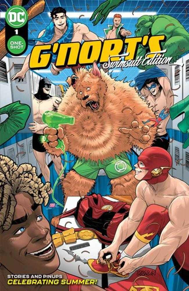 FUN IN THE SUN STARRING...G'NORT! Art by Paul Pelletier, Nicola Scott, Mikel Janin, Jeff Dekal, Daniel Sampere, Gleb Melnikov, Derrick Chew, Stanley Artgerm Lau, Emanuela Lupacchino, Joelle Jones, Megan Huang, Terry Dodson, Babs Tarr, Pete Woods, Joe Quinones, Helene Lenoble, Otto Schimdt, Michael Allred, Sweeney Boo, David Talaski, Jenny Frison, and others! You may know G'nort as the bumbling Green Lantern who protects Space Sector 68. Then again, you may not know G'nort at all. Whatever the case, get ready to see him in his newest role as host and proprietor of this very special swimsuit edition comic! Join our favorite fuzzball as he showcases some of our best swimsuit covers and our most swim-tacular stories! From the Flash in a Speed Force Speedo to Batman in a bat(hing) suit, this very special one-shot is summer fun from (bikini) top to (bikini) bottom. Also collecting some of the steamiest swimsuit covers from DC's best talent, all in one place for the very first time!