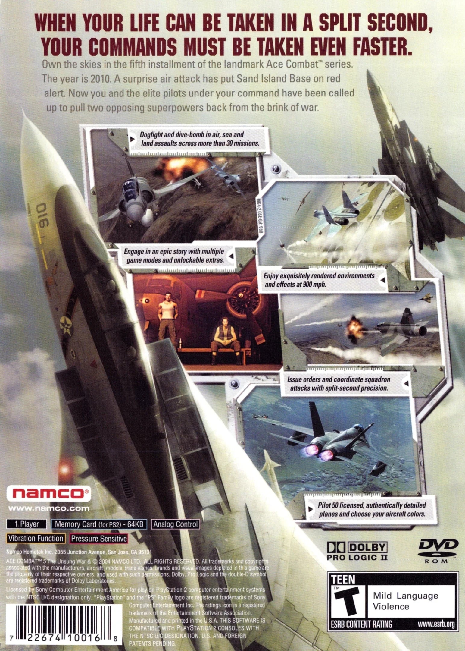 After attempting to intercept an unidentified aircraft, the entire 108th Tactical Fighter Squadron was destroyed. As the base scrambles its defenses and goes on red alert, you and your fellow elite fighter pilots are called upon to protect your home nation of Osea. Missions in Ace Combat 5 include engaging enemy planes in dogfights, destroying ground targets, and making split-second decisions. With Wingman Command, which lets you issue orders and coordinate group attacks, the fate of an entire squadron is in your hands.