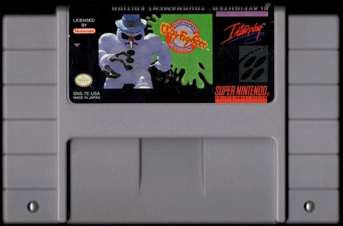 Clay never had it so good. This outrageous new Clay Fighter Tournament Edition lets you smack it up with eight friends at a time. So, let the clay fly. More punching power with three and four hit combos and daster game speed (twice as fast as the original!). More balanced game play increases your chance of survival. Setup up single elimination, double elimination and sudden death tournaments with four or eight of your friends - or use the tournament format to match your skills against the computer. Keep track of your tournament with the Tournament Ladder - complete with winners and losers brackets. Expanded voice over gives you more trash talking and blow-by-blow descriptions throughout the game. Bright, bolder graphics and awesome new clay backgrounds. Pick a name, any name, to customize your character. The Biggest-Ever Super NES Fighting Game! 24 Meg Cart