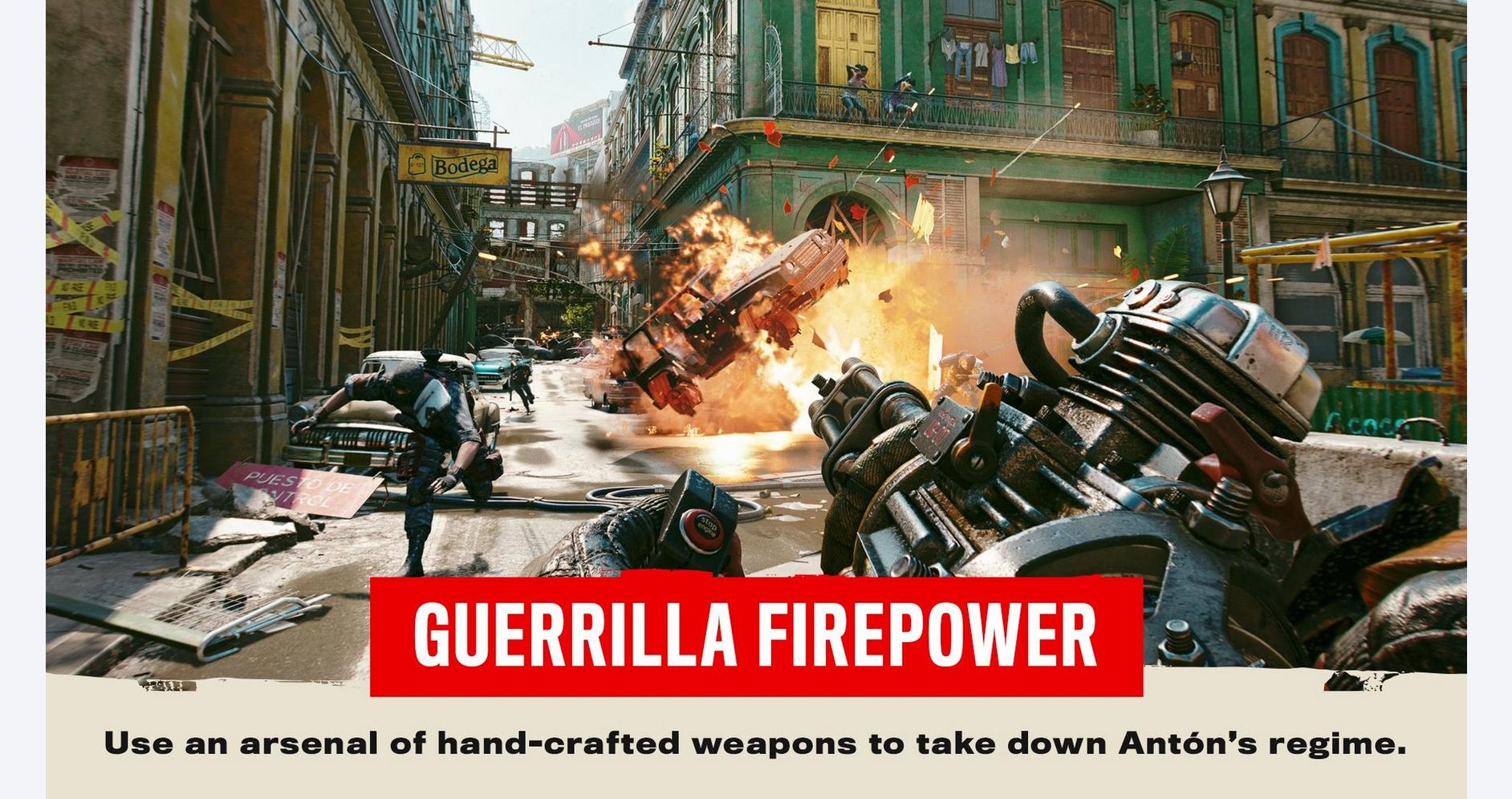 In Far Cry 6 you take on the responsibilities of local Yaran and guerilla fighter Dani Rojas. Experience the brilliant open-world gameplay and explore stunning new terrain in this gripping, first-person shooter. Join the revolution and push back against the oppressive regime of dictator Antón Castillo and his teenage son Diego, brought to life by Hollywood stars Giancarlo Esposito and Anthony Gonzalez. To even the odds against Antón’s military, you’ll have to adopt the Resolver philosophy, employing an arsenal of unique and surprising new weapons, vehicles and animal companions to ignite a revolutionary movement that will burn the tyrannical regime to the ground. Features Become A Guerrilla - Play Dani Rojas as male or female and experience a compelling storyline that takes you from being a reluctant citizen to a leader fighting against Antón's regime. Jump into the action and chaos of guerrilla combat and gather soldiers and resources to help you in the fight. All New Animal Companions - No guerrilla should go at it alone. Pair up with all-new animal companions like Chorizo, the adorable wiener dog no enemy soldier can ignore, and Guapo, the hungry pet crocodile of your guerrilla mentor, Juan Cortez. Power Of An Army - Embrace the Resolver philosophy and create a deadly arsenal of makeshift weapons. Give Antón’s troops a taste of guerrilla ingenuity, from a motorcycle engine powered minigun to homing missile throwing backpacks. Yara Torn Apart - Explore the largest Far Cry to date as you traverse jungles, beaches and urban landscapes. From taking the reins of a horse to commandeering a tank, choose your favorite ride to navigate an entire island nation.