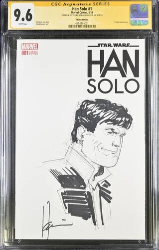 CGC Cert # 4514444001 Title Han Solo Issue 1 Issue Date 8/16 Issue Year 2016 Publisher Marvel Comics Variant Sketch Edition Grade 9.6 Page Quality WHITE Grade Category Signature Art Comments Marjorie Liu story Mark Brooks art Key Comments Partial blank cover. Grader Notes CGC Signature Series witnessed the Howard Chaykin signing on 8/18/24. spine stress lines cover wear left center of back cover Signatures SIGNED & SKETCH BY HOWARD CHAYKIN ON 8/18/24