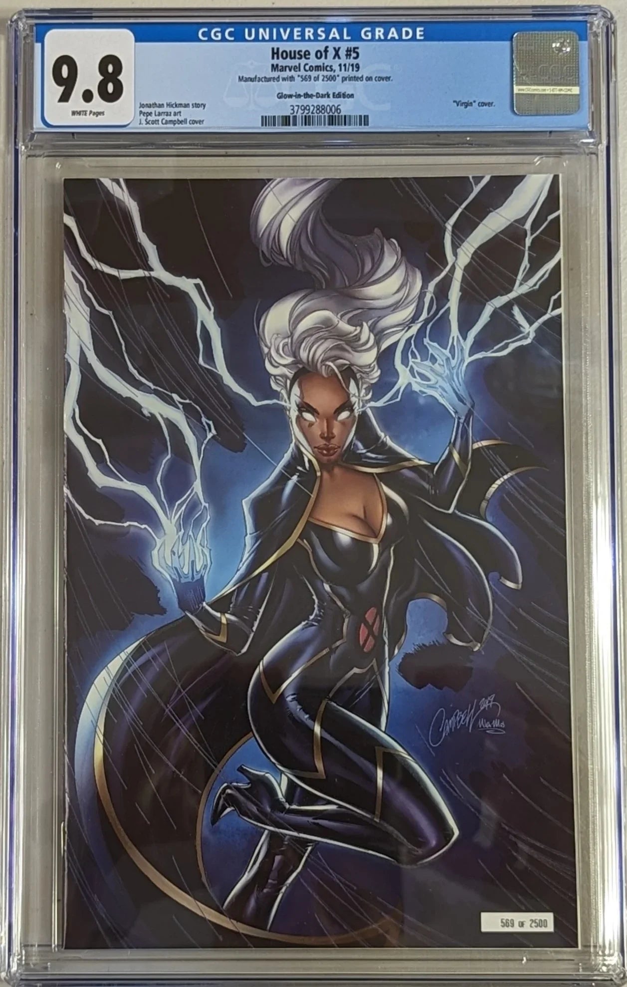 Title House of X Issue 5 Issue Date 11/19 Issue Year 2019 Publisher Marvel Comics Variant Glow-in-the-Dark Edition Grade 9.8 Page Quality WHITE Grade Date 04/21/2021 Grade Category Modern Label Text Manufactured with ""569 of 2500"" printed on cover. Art Comments Jonathan Hickman story Pepe Larraz art J. Scott Campbell cover Key Comments ""Virgin"" cover.