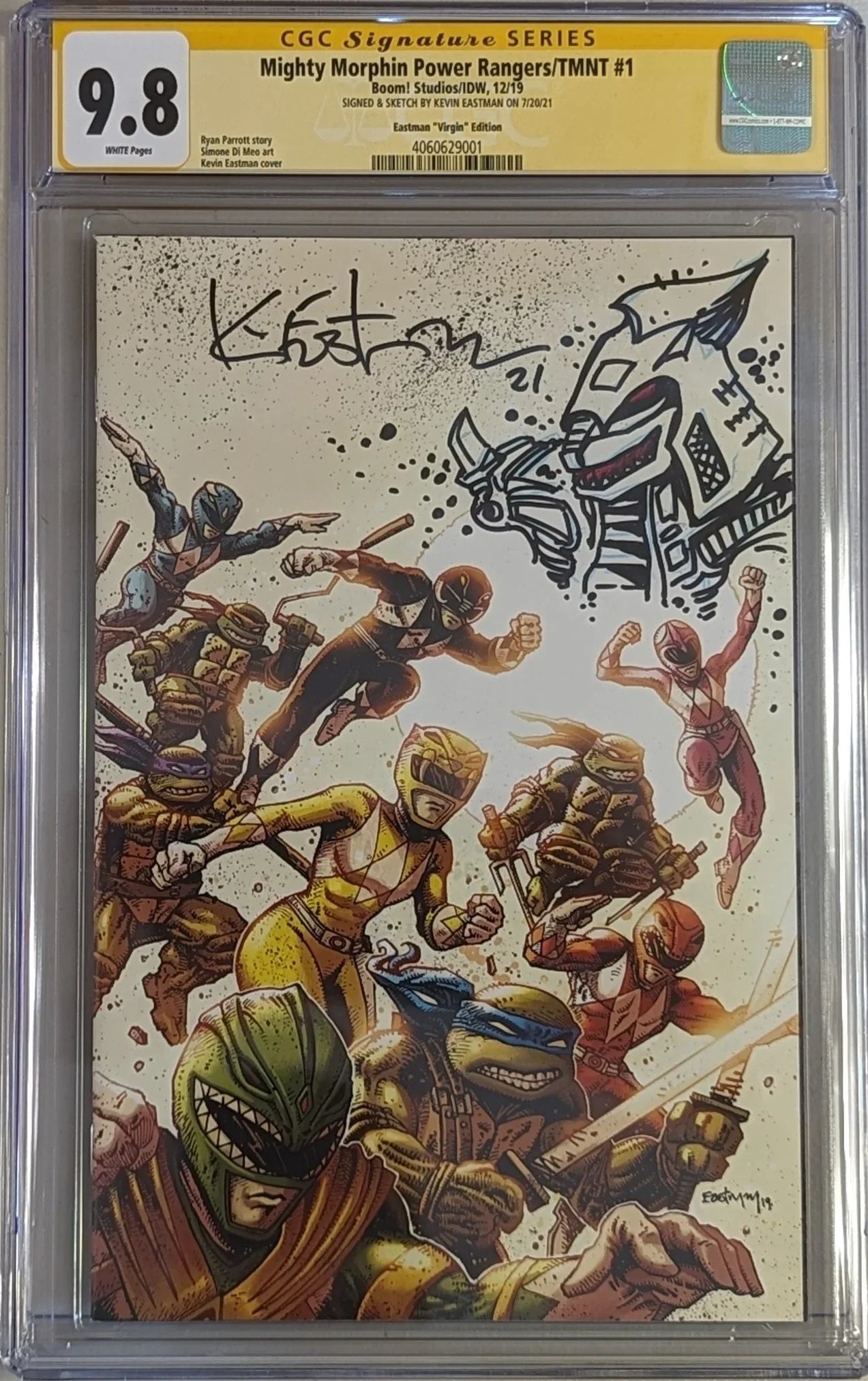 Title Mighty Morphin Power Rangers/TMNT Issue 1 Issue Date 12/19 Issue Year 2019 Publisher Boom! Studios/IDW Variant Eastman ""Virgin"" Edition Grade 9.8 Page Quality WHITE Grade Date 05/12/2022 Grade Category Signature Art Comments Ryan Parrott story Simone Di Meo art Kevin Eastman cover Signatures SIGNED & SKETCH BY KEVIN EASTMAN ON 7/20/21