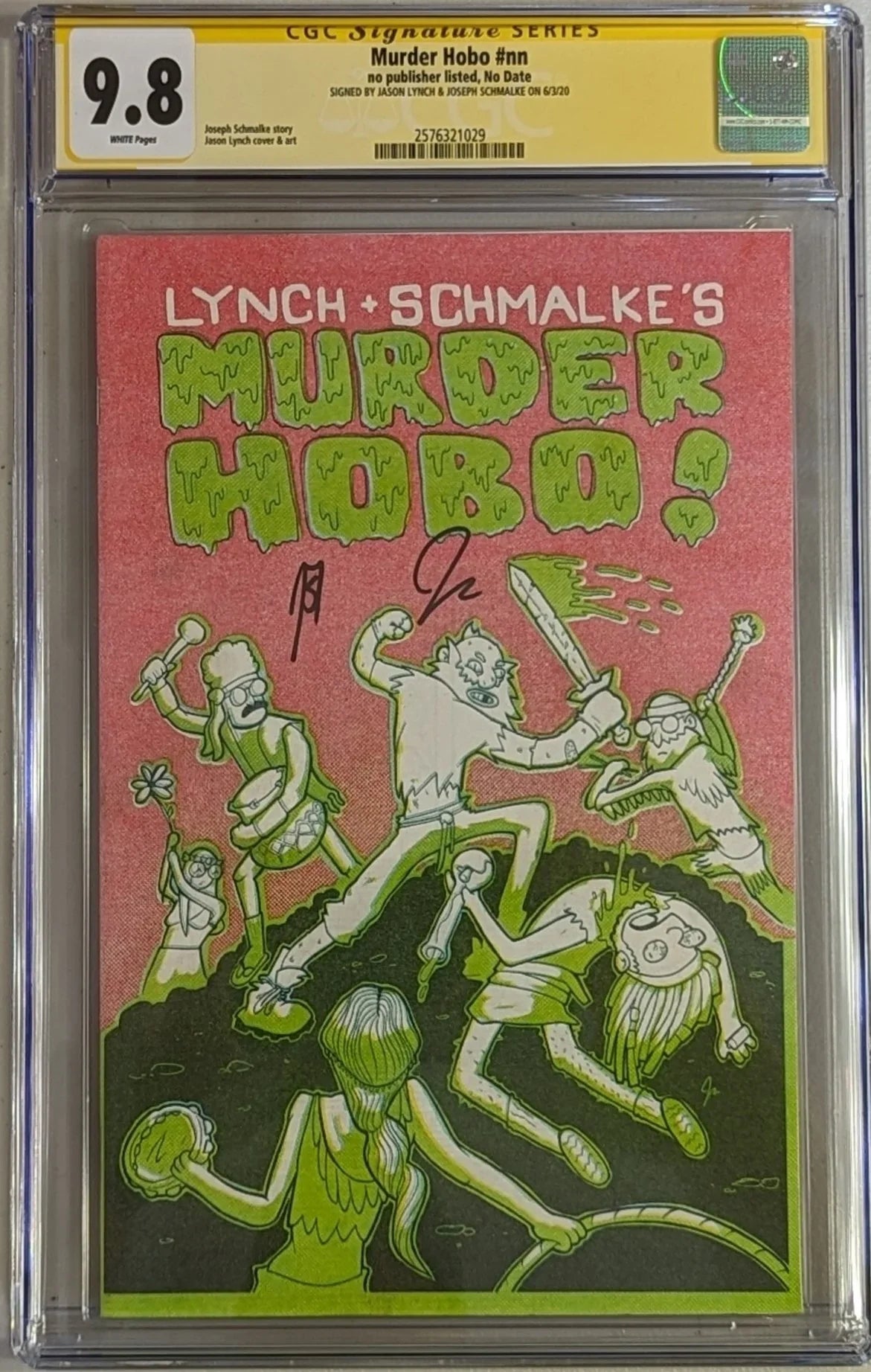 CGC Cert # 2576321029 Title Murder Hobo Issue nn Issue Date No Date Issue Year 1900 Publisher no publisher listed Grade 9.8 Page Quality WHITE Grade Date 07/02/2020 Grade Category Signature Art Comments Joseph Schmalke story Jason Lynch cover & art Grader Notes Unavailable Signatures SIGNED BY JASON LYNCH & JOSEPH SCHMALKE ON 6/3/20