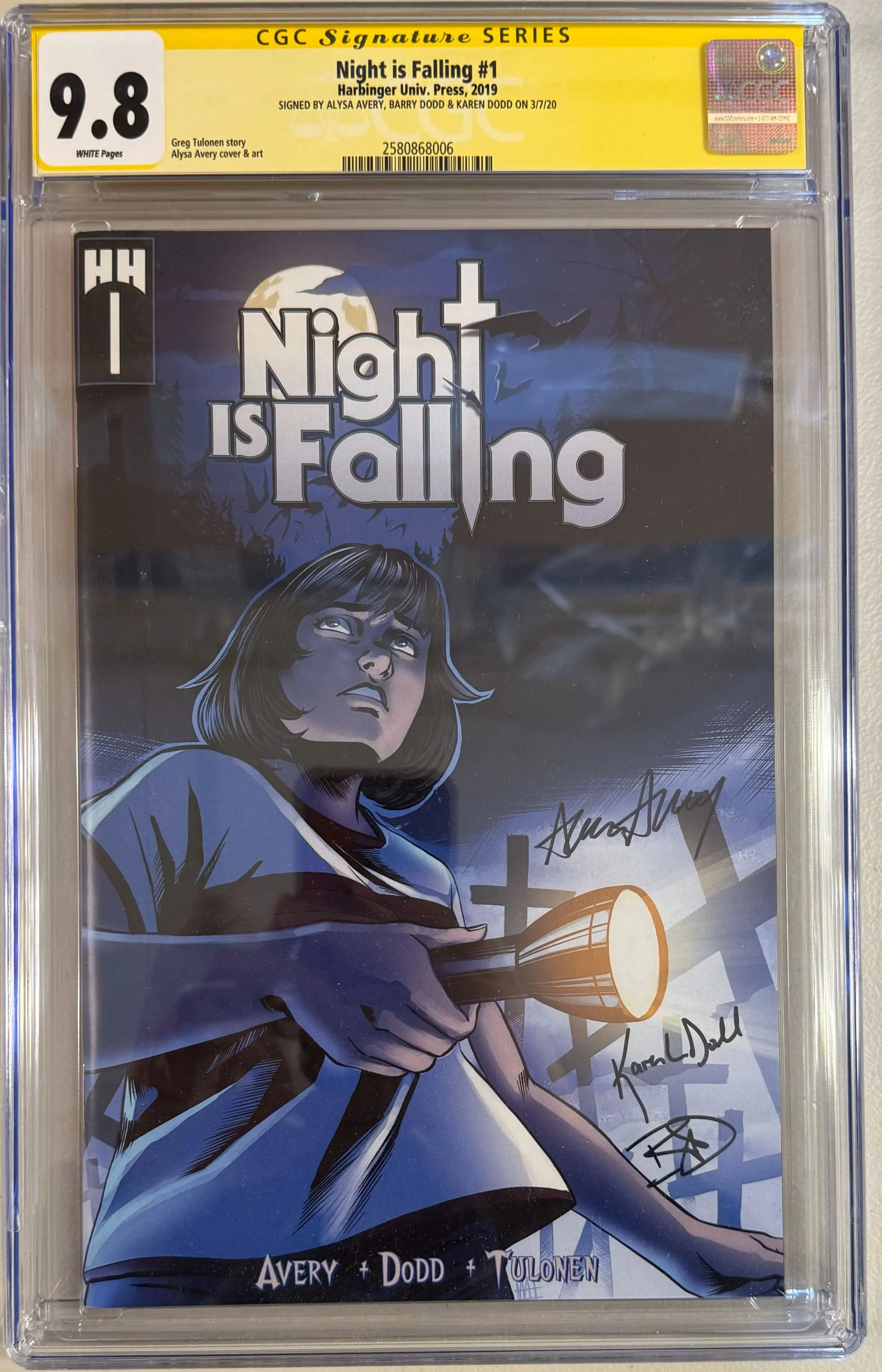 Title Night is Falling Issue 1 Issue Date 2019 Issue Year 2019 Publisher Harbinger Univ. Press Grade 9.8 Page Quality WHITE Grade Date 04/06/2020 Grade Category Signature Art Comments Greg Tulonen story Alysa Avery cover & art Signatures SIGNED BY ALYSA AVERY, BARRY DODD & KAREN DODD ON 3/7/20