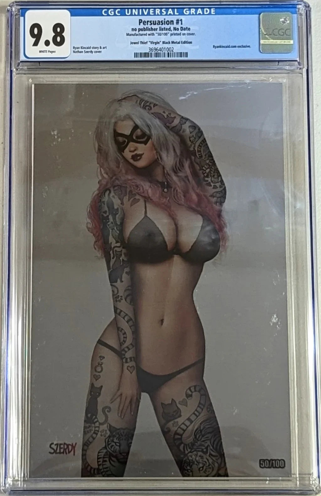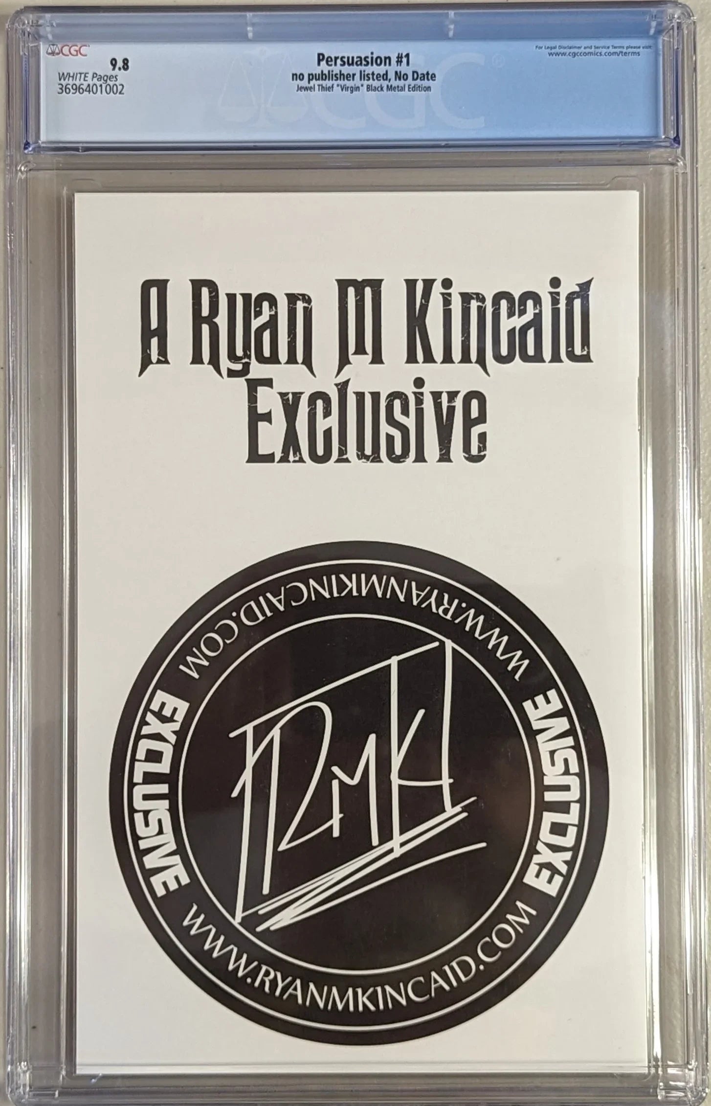Title Persuasion Issue 1 Issue Date No Date Issue Year 1900 Publisher no publisher listed Variant Jewel Thief ""Virgin"" Black Metal Edition Grade 9.8 Page Quality WHITE Grade Date 08/19/2020 Grade Category Universal Label Text Manufactured with ""50/100"" printed on cover. Art Comments Ryan Kincaid story & art Nathan Szerdy cover Key Comments Ryankincaid.com exclusive.