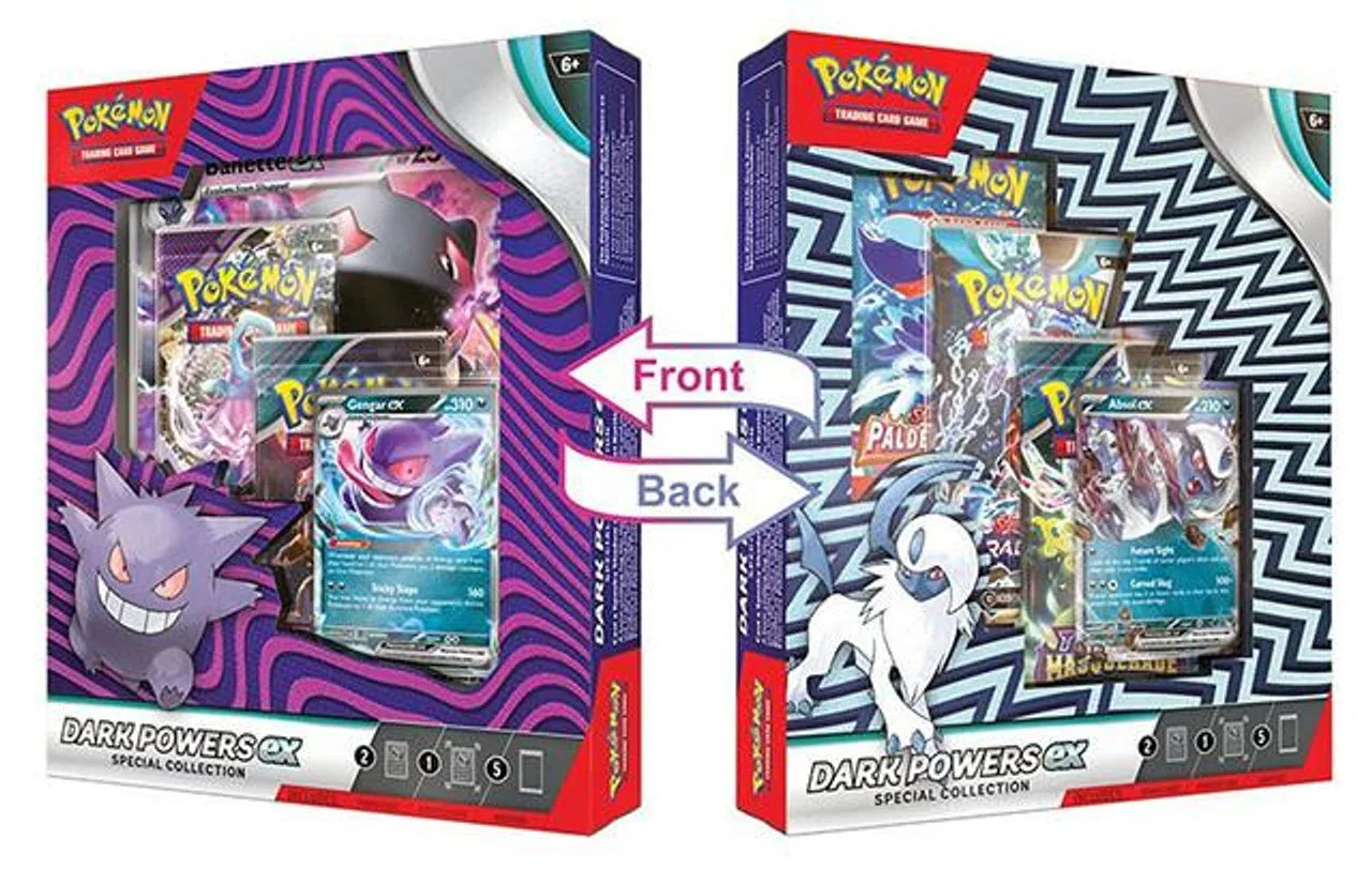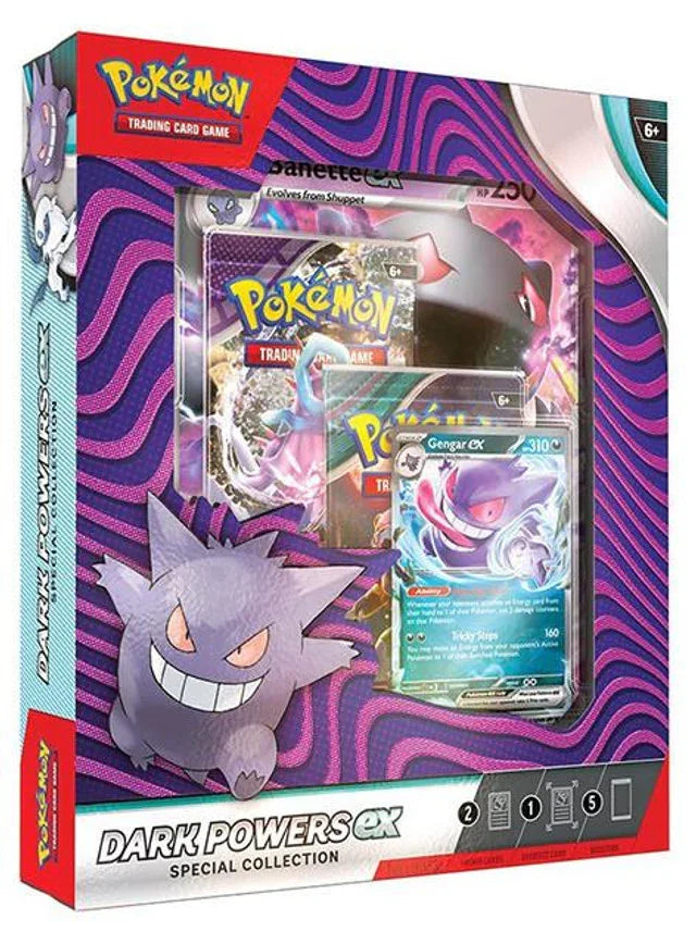 Cast a Spooky Shadow over Your Next Battle! A bone-chilling fog fills the air as night falls and eerie Pokémon ex come out to play! Boasting big HP and powerful attacks, Absol ex and Gengar ex bring the sneaky tricks of the Darkness type to your deck, while the ghostly Banette ex shows off Psychic-type prowess as a foil oversize card for display. Even more Pokémon await inside the booster packs in this special set! Inside the Box: 1 Foil card featuring Gengar ex 1 Foil card featuring Absol ex 1 Oversize foil card featuring Banette ex 5 Pokémon TCG booster packs 1 Code card for Pokémon TCG Live Configuration: 10 cards per pack 5 packs per box