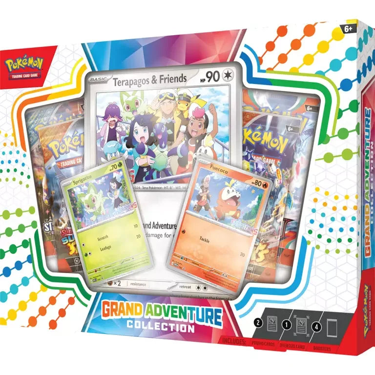 Add the Brave Olivine to Your Collection! With a Pokémon at your side, you're set for adventure! Liko and Roy have journeyed far alongside their Pokémon companions, now teaming up with Terapagos to uncover the mythical paradise of Laqua. You can join the fun with playable foil promo cards of Sprigatito and Fuecoco, along with an oversized promo card featuring Terapagos & Friends for your display. Each card showcases stunning artwork inspired by Pokémon Horizons: The Series. To complete this exciting collection, you'll also receive four Pokémon TCG booster packs filled with even more fantastic cards! Features •1 Sprigatito foil promo card featuring art of Liko and Sprigatito from Pokémon Horizons: The Series •1 Fuecoco foil promo card featuring art of Roy and Fuecoco from Pokémon Horizons: The Series •1 oversize foil promo card featuring Terapagos & Friends •4 Pokémon TCG booster packs