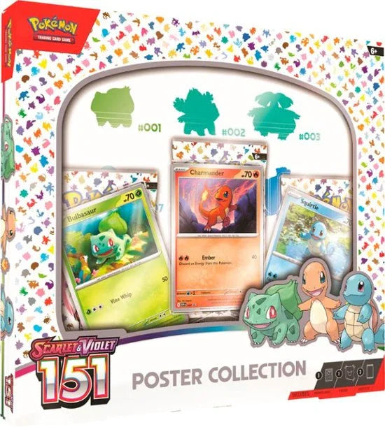 Your very own Pokémon legend unfolds! An epic journey through the Kanto region wouldn’t be complete without a first partner Pokémon! Add Bulbasaur, Charmander, and Squirtle to your team as playable foil promo cards, then work on completing your Kanto Pokédex by opening more booster packs from the special Scarlet & Violet—151 expansion. On top of it all, you’ll find a colorful poster that’s ready to hang wherever you like! The Pokémon TCG: Scarlet & Violet—151 Poster Collection includes: 3 foil promo cards featuring Bulbasaur, Charmander, and Squirtle 1 poster with a Scarlet & Violet—151 theme 3 Pokémon TCG: Scarlet & Violet—151 booster packs A code card for Pokémon TCG Live Suitable for ages 6 and up