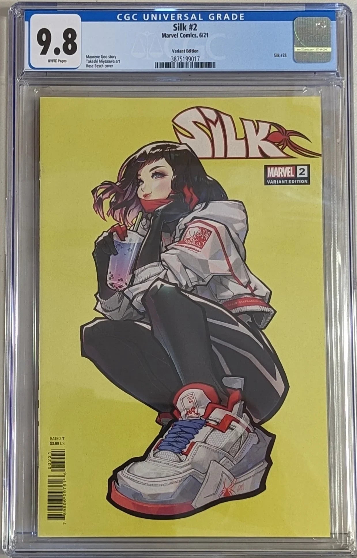 CGC Cert # 3875199017 Title Silk Issue 2 Issue Date 6/21 Issue Year 2021 Publisher Marvel Comics Variant Variant Edition Grade 9.8 Page Quality WHITE Grade Date 10/26/2021 Grade Category Modern Art Comments Maurene Goo story Takeshi Miyazawa art Rose Besch cover Key Comments Silk #28