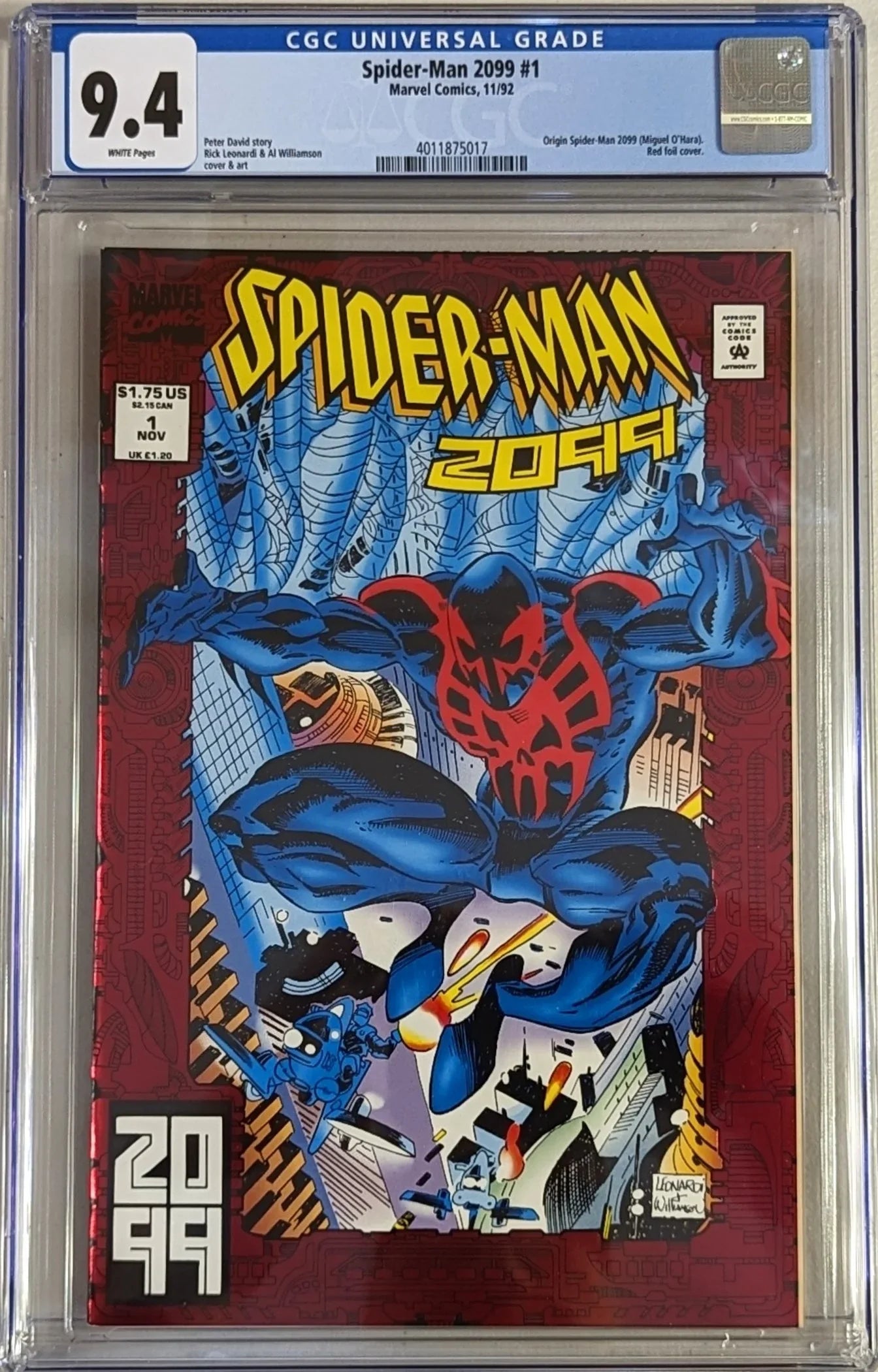 CGC Cert # 4011875017 Title Spider-Man 2099 Issue 1 Issue Date 11/92 Issue Year 1992 Publisher Marvel Comics Grade 9.4 Page Quality WHITE Grade Date 05/06/2022 Grade Category Modern Art Comments Peter David story Rick Leonardi & Al Williamson cover & art Key Comments Origin Spider-Man 2099 (Miguel O'Hara). Red foil cover.
