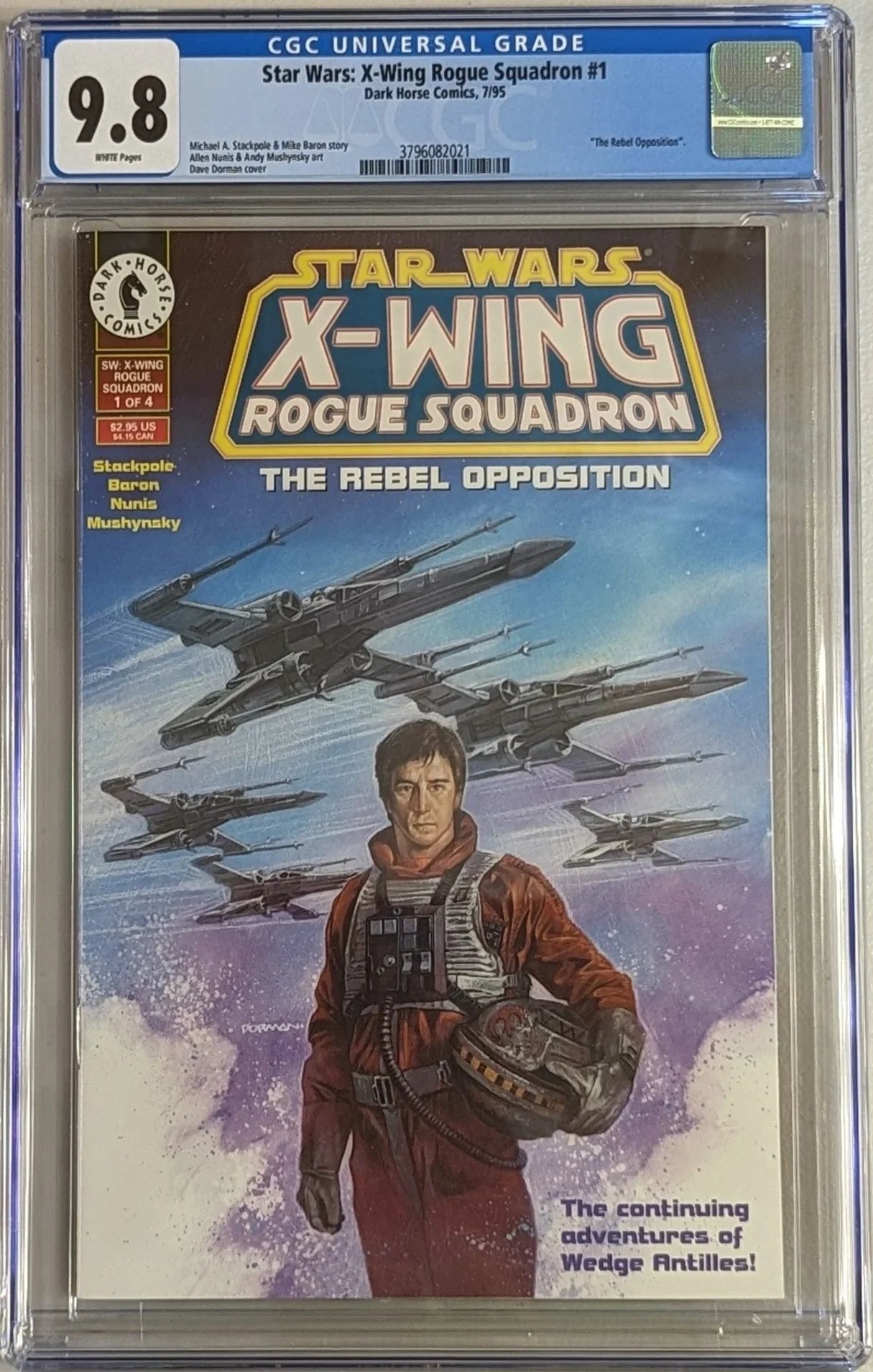 CGC Cert # 3796082021 Title Star Wars: X-Wing Rogue Squadron Issue 1 Issue Date 7/95 Issue Year 1995 Publisher Dark Horse Comics Grade 9.8 Page Quality WHITE Grade Date 04/13/2021 Grade Category Modern Art Comments Michael A. Stackpole & Mike Baron story Allen Nunis & Andy Mushynsky art Dave Dorman cover Key Comments ""The Rebel Opposition"". Grader Notes Unavailable