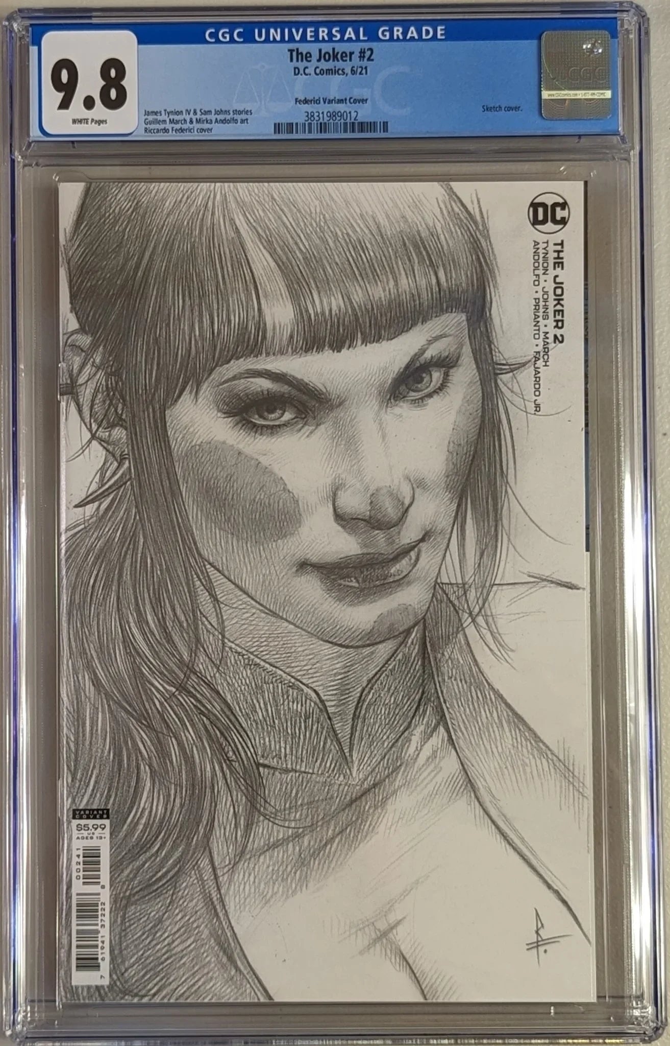 CGC Cert # 3831989012 Title The Joker Issue 2 Issue Date 6/21 Issue Year 2021 Publisher D.C. Comics Variant Federici Variant Cover Grade 9.8 Page Quality WHITE Grade Date 07/02/2021 Grade Category Modern Art Comments James Tynion IV & Sam Johns stories Guillem March & Mirka Andolfo art Riccardo Federici cover Key Comments 1st appearance of Vengeance. Sketch cover.