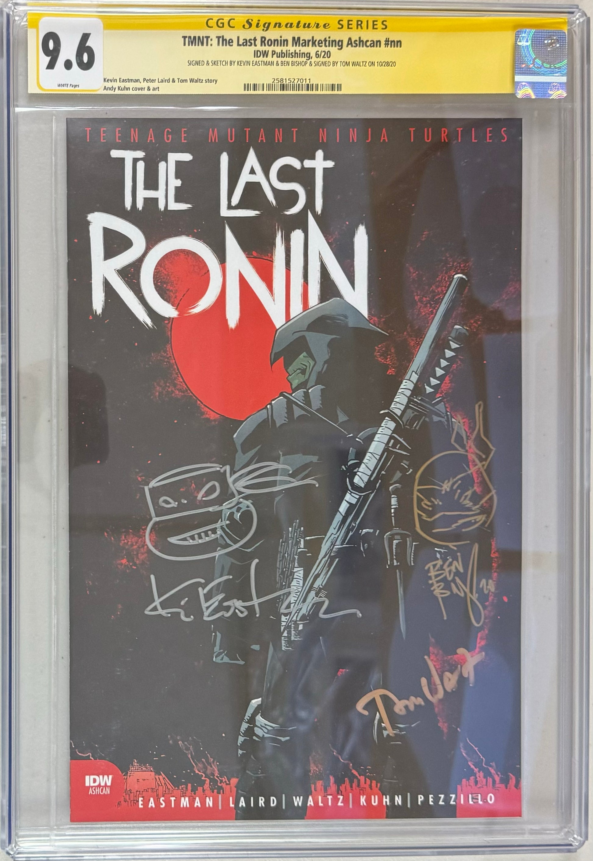 CGC Cert # 2581527011 Title TMNT: The Last Ronin Marketing Ashcan Issue nn Issue Date 6/20 Issue Year 2020 Publisher IDW Publishing Grade 9.6 Page Quality WHITE Grade Date 03/20/2021 Grade Category Signature Label Text SIGNED & SKETCH BY KEVIN EASTMAN & BEN BISHOP & SIGNED BY TOM WALTZ ON 10/28/20 Art Comments Kevin Eastman, Peter Laird & Tom Waltz storyAndy Kuhn cover & art