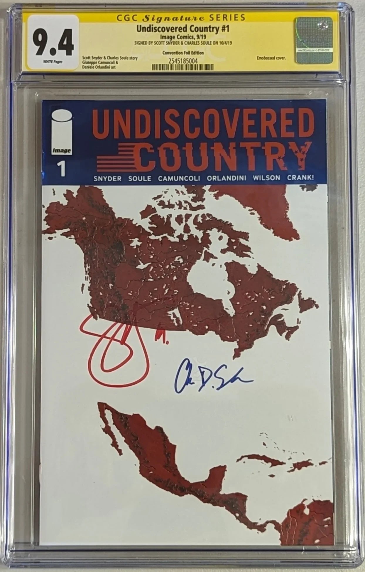 CGC Cert # 2545185004 Title Undiscovered Country Issue 1 Issue Date 9/19 Issue Year 2019 Publisher Image Comics Variant Convention Foil Edition Grade 9.4 Page Quality WHITE Grade Date 11/21/2019 Grade Category Signature Art Comments Scott Snyder & Charles Soule story Giuseppe Camuncoli & Daniele Orlandini art Key Comments Embossed cover. Grader Notes Unavailable Signatures SIGNED BY SCOTT SNYDER & CHARLES SOULE ON 10/4/19