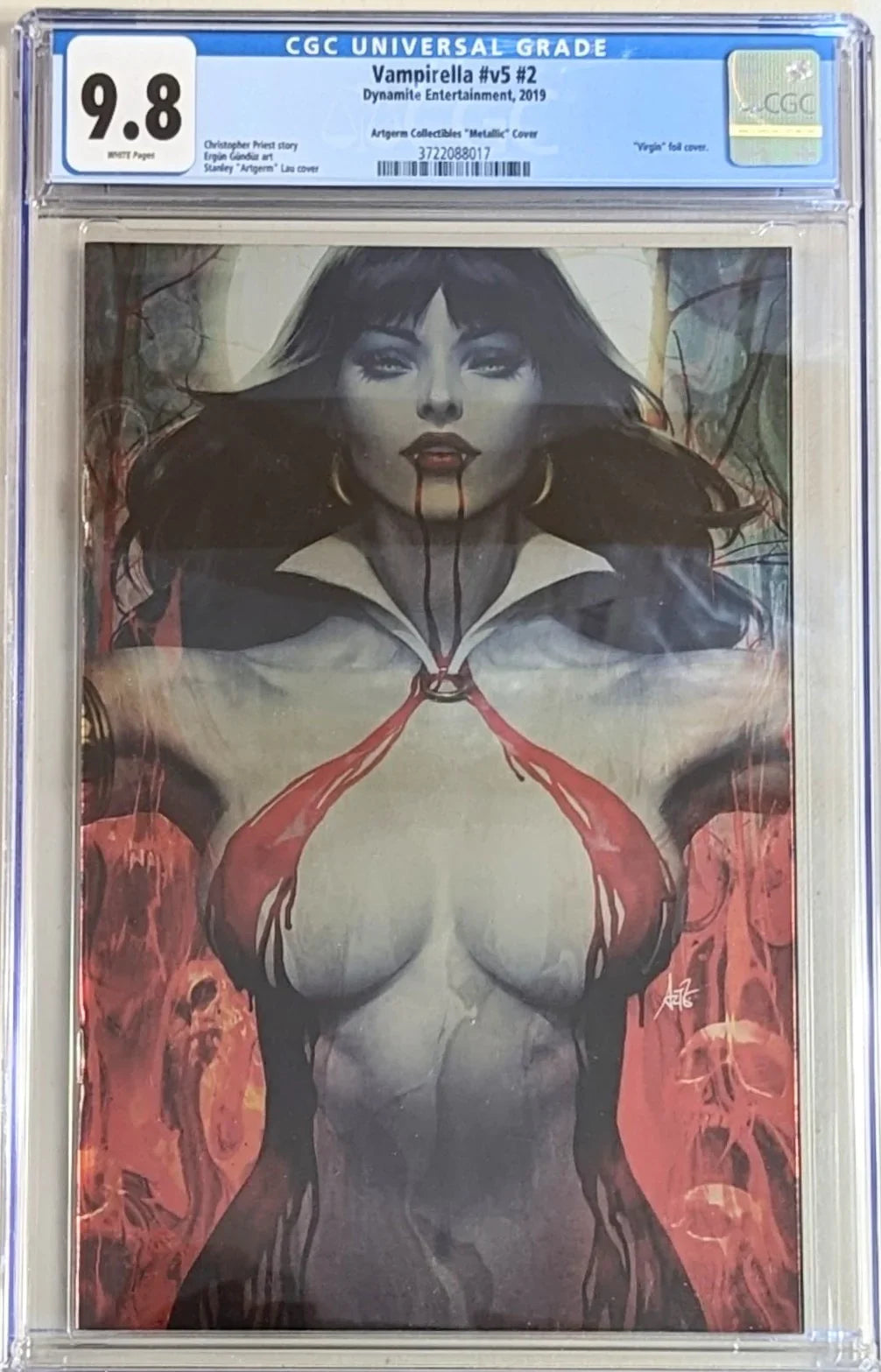 Title Vampirella Issue v5 #2 Issue Date 2019 Issue Year 2019 Publisher Dynamite Entertainment Variant Artgerm Collectibles ""Metallic"" Cover Grade 9.8 Page Quality WHITE Grade Date 10/30/2020 Grade Category Modern Art Comments Christopher Priest story Erg�n G�nd�z art Stanley ""Artgerm"" Lau cover Key Comments ""Virgin"" metal cover.
