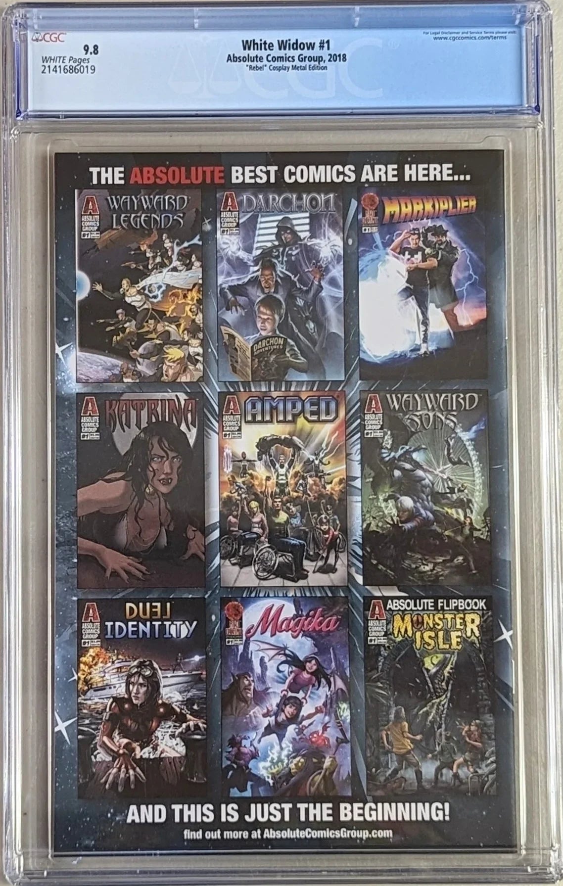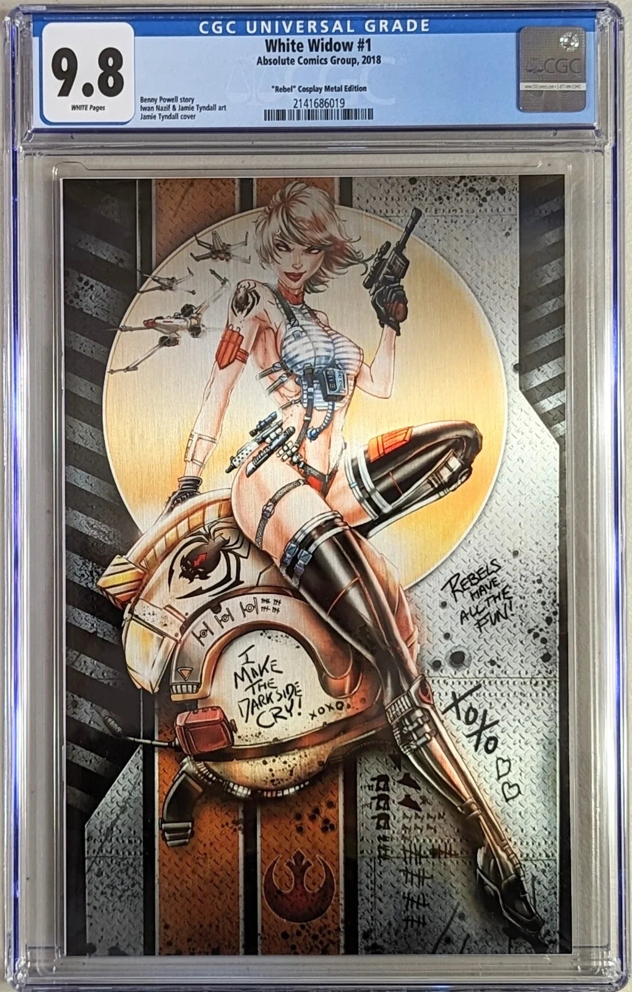 Title White Widow Issue 1 Issue Date 2018 Issue Year 2018 Publisher Absolute Comics Group Variant ""Rebel"" Cosplay Metal Edition Grade 9.8 Page Quality WHITE Grade Date 08/07/2020 Grade Category Modern Art Comments Benny Powell story Iwan Nazif & Jamie Tyndall art Jamie Tyndall cover
