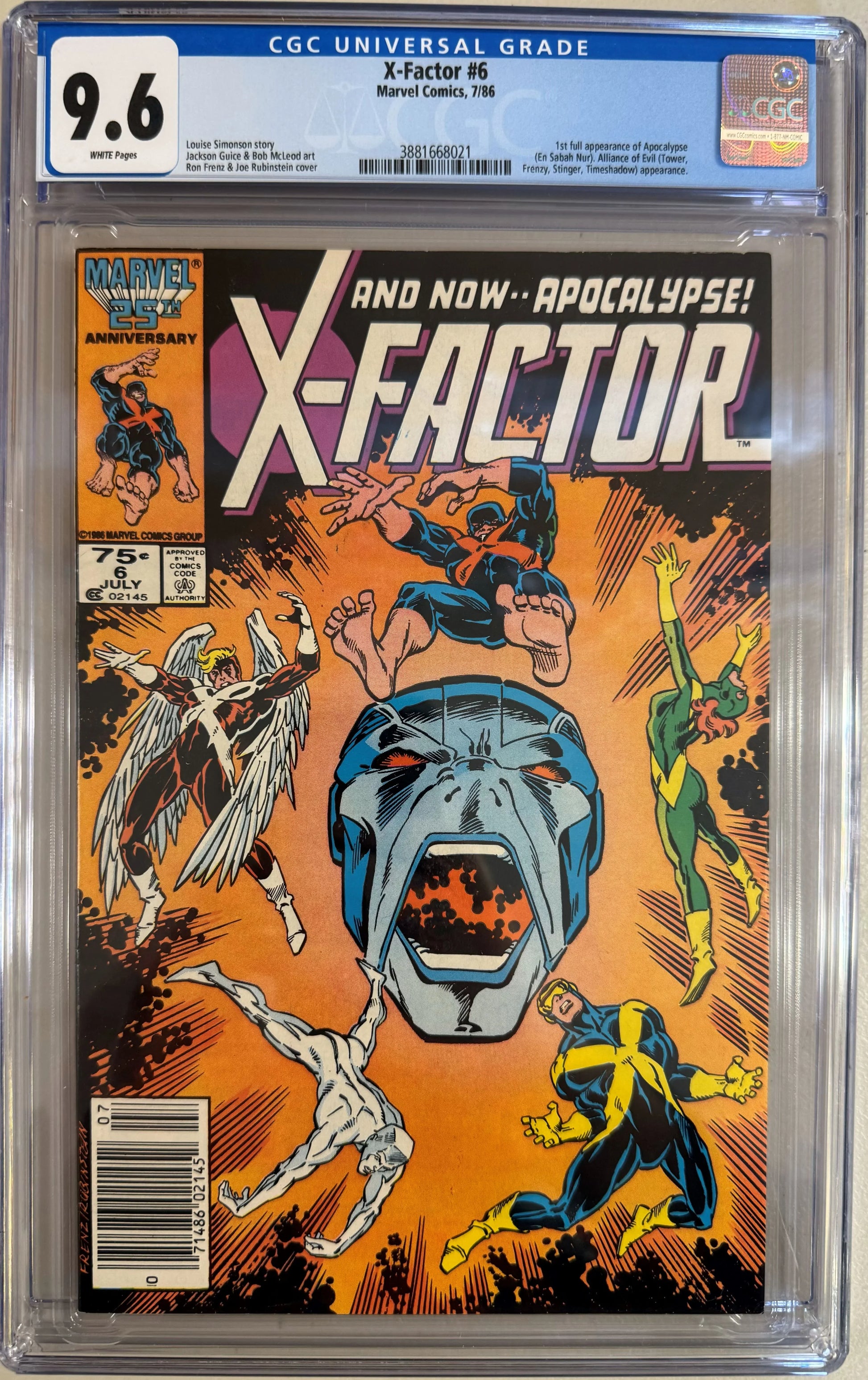 Title X-Factor Issue 6 Issue Date 7/86 Issue Year 1986 Publisher Marvel Comics Grade 9.6 Page Quality WHITE Grade Date 11/10/2021 Grade Category Modern Art Comments Louise Simonson story Jackson Guice & Bob McLeod art Ron Frenz & Joe Rubinstein cover Key Comments 1st full appearance of Apocalypse (En Sabah Nur). Alliance of Evil (Tower, Frenzy, Stinger, Timeshadow) appearance.